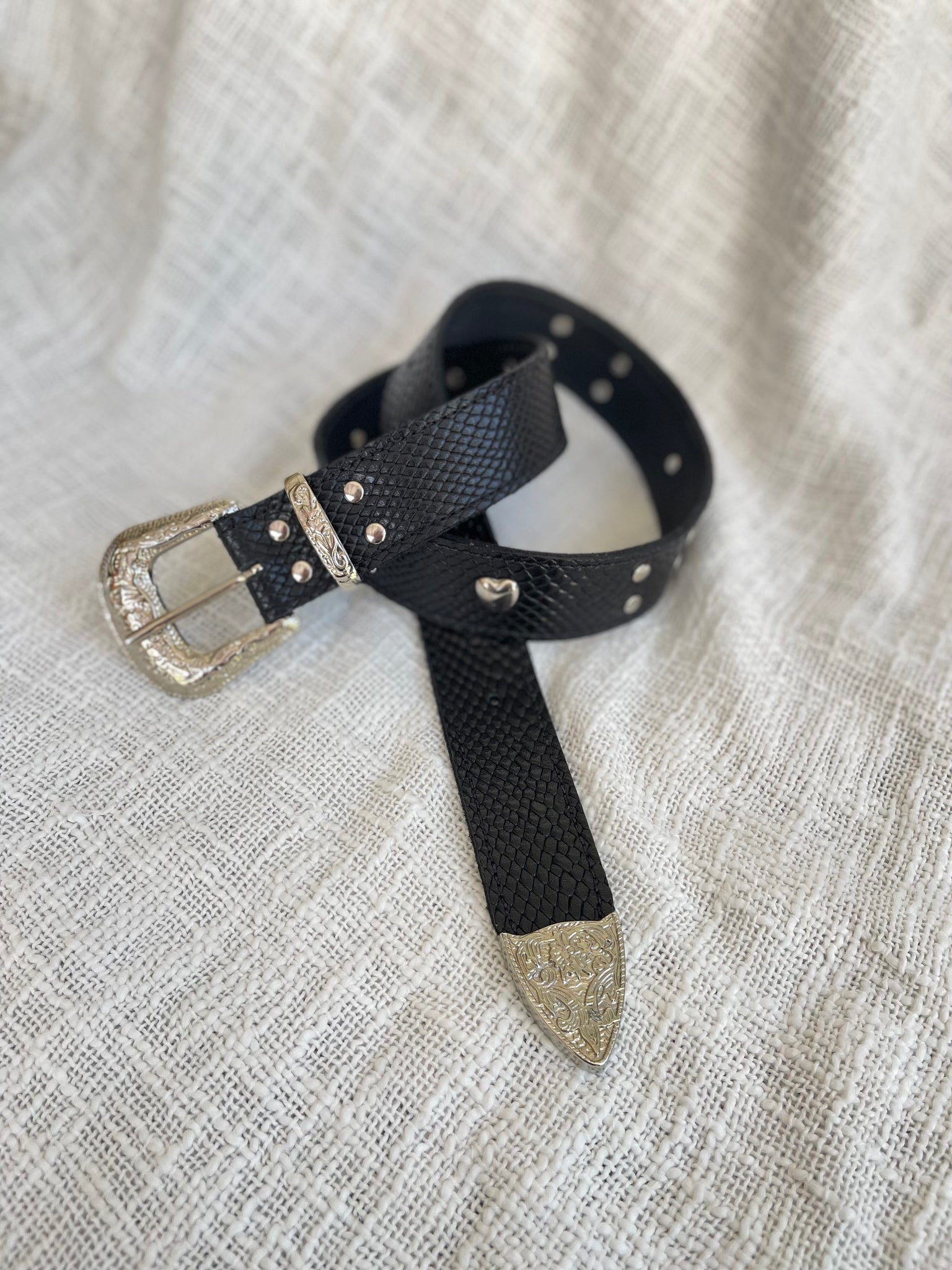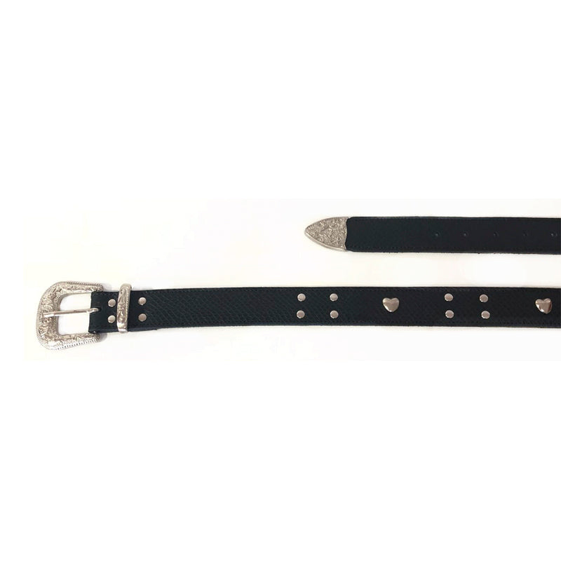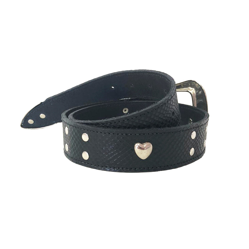 Cinturón de cuero negro texturado con aplicaciones de corazón y tachas brillantes.