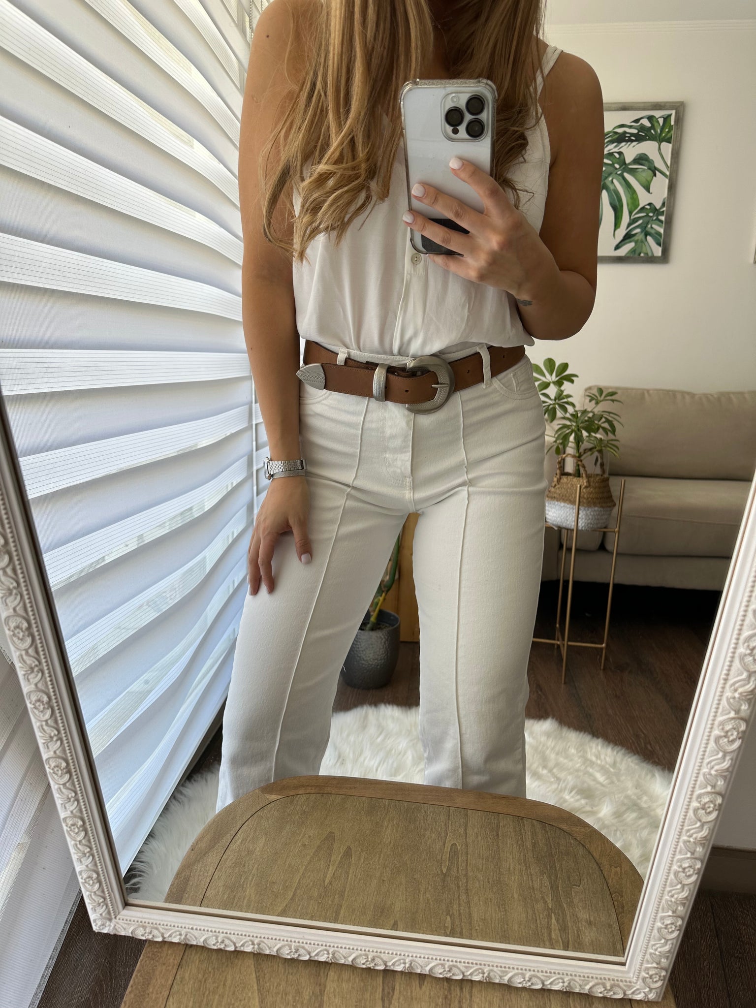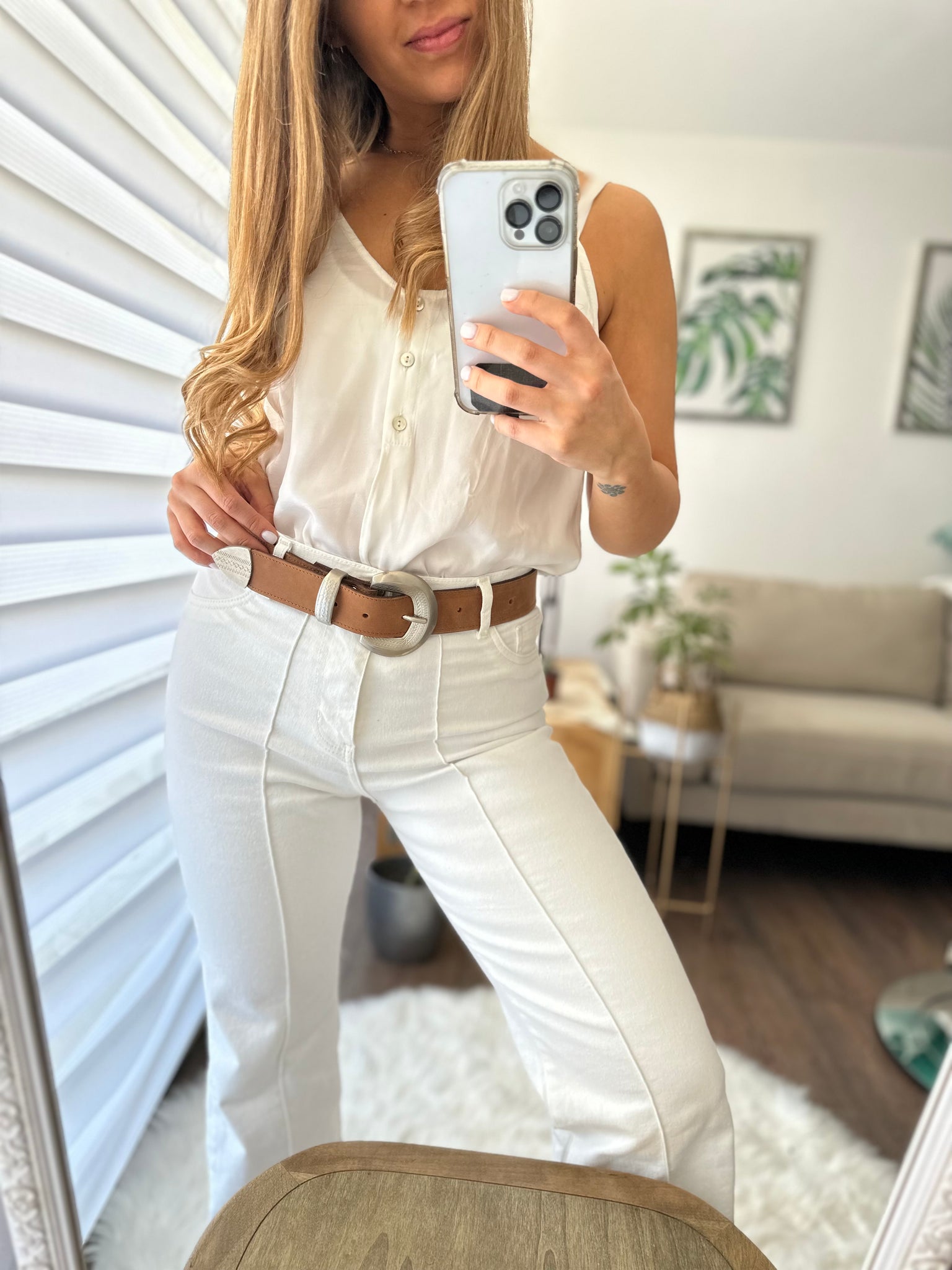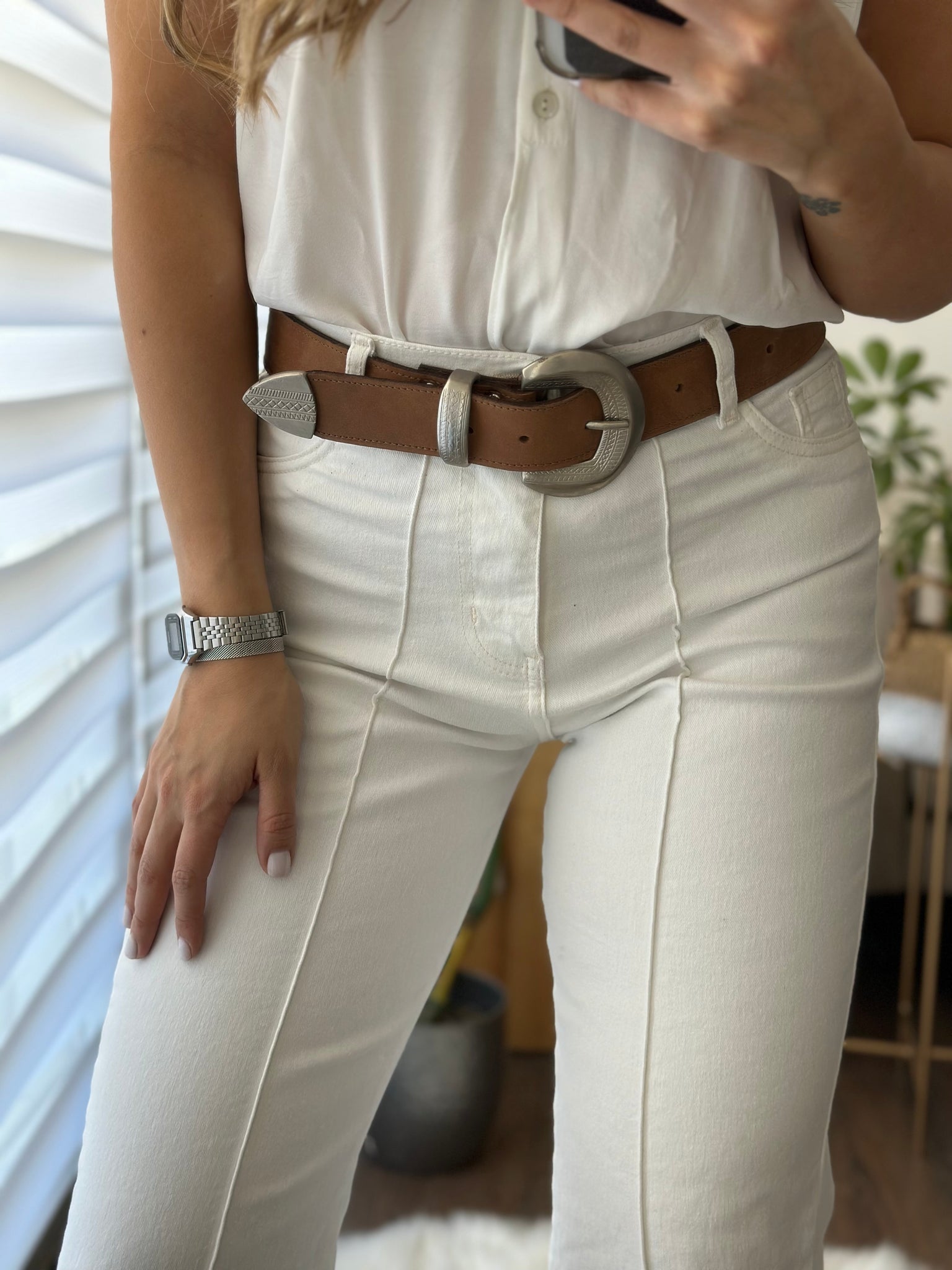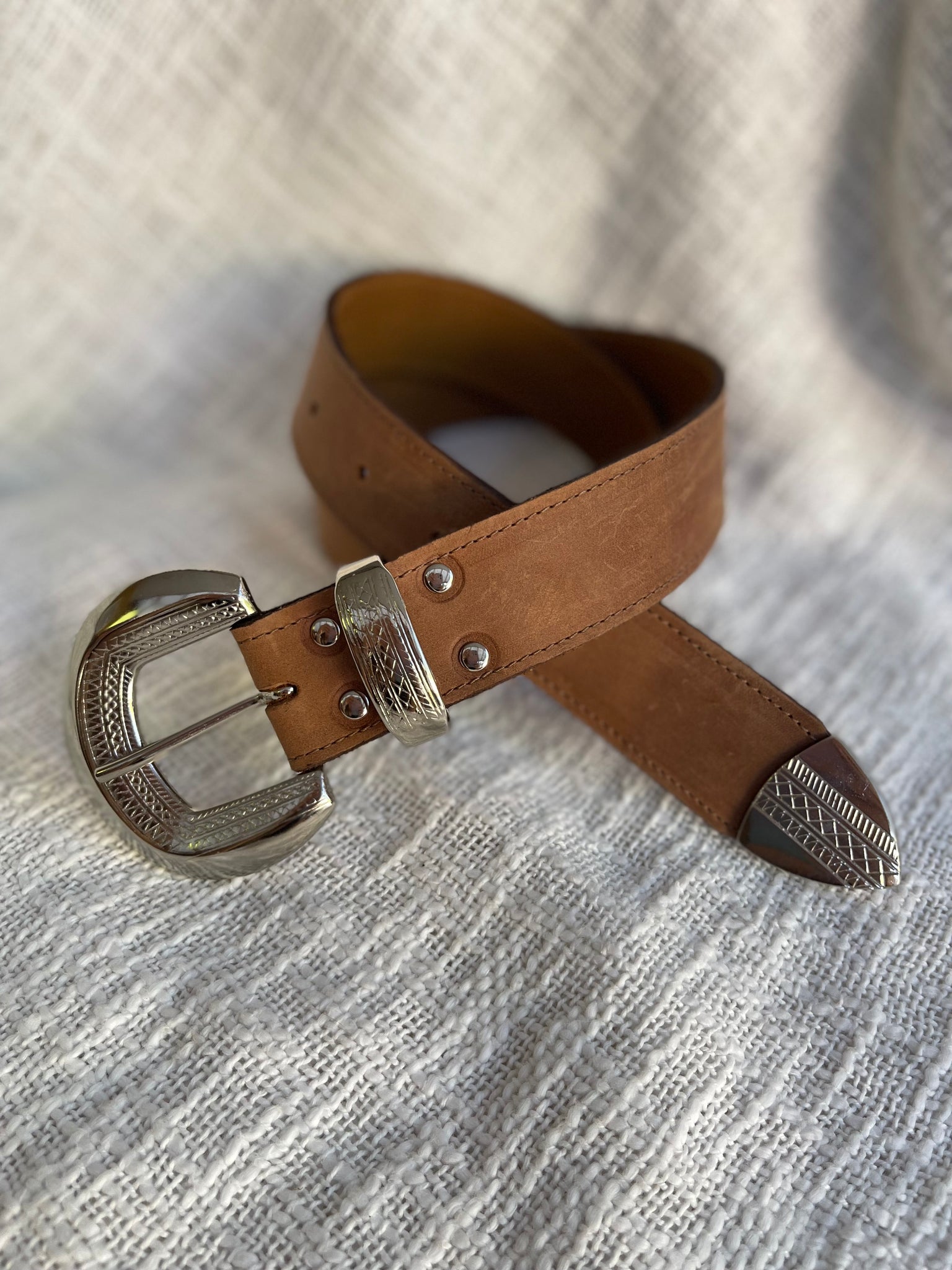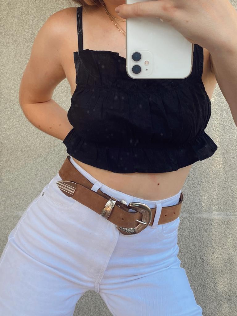 Cinturón de cuero café liso graso con hebilla brillante, hecho a mano en Chile